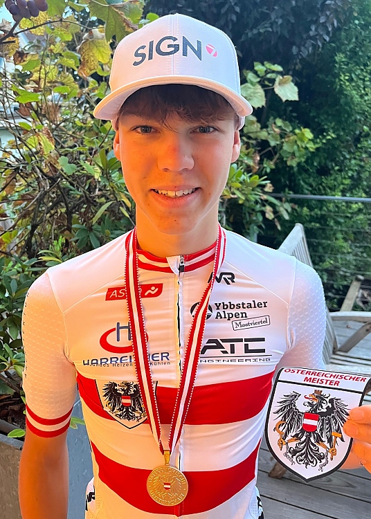 Den bisher wohl größten Erfolg seiner noch jungen Rennfahrerkarriere errang Paul am vergangenen Wochenende bei den Österreichischen Meisterschaften der Nachwuchsfahrer im Straßenrennen: Bei herrlichem Spätsommerwetter wurde auf einem hügeligen Rundkurs in Steinhaus bei Wels in den Nachwuchskategorien um Edelmetall gekämpft. Aufgrund seiner heuer bereits erbrachten Leistungen war Paul zweifellos zum Favoritenkreis im Rennen der U15-Fahrer zu zählen, doch selbstverständlich hatten auch zahlreiche weitere Fahrer große Ambitionen „Gold“ zu holen. An den Start gingen diesmal etwas über 40 Fahrer/innen (U15m + U17w). Nach 42km trat eine etwa 15-köpfige Spitzengruppe zum stark ansteigenden Zielsprint an. Paul erkämpfte sich wie geplant eine gute Position in der Zielkurve und war dann aufgrund seines starken Antritts nicht mehr zu halten: Somit Sieg für Paul und der Meistertitel 2023 in der Kategorie U15! Ein großartiger Erfolg!